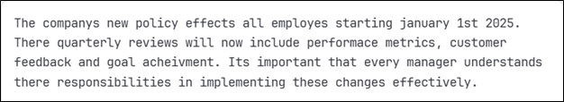 This example demonstrates how proofreading catches multiple error types that could significantly impact reader comprehension and professional perception.